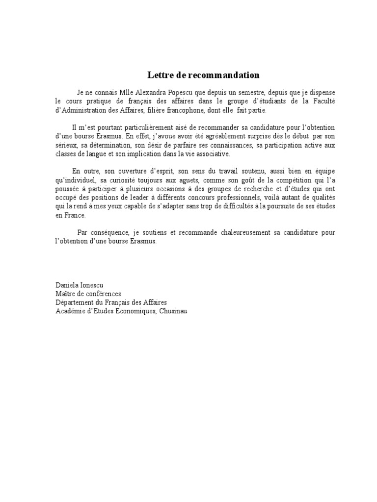 Scrisoare de recomandare student erasmus. Ca student ca. Lettre de recommandation Je ne connais Mlle Alexandra Popescu que depuis un semestre depuis que je dispense le cours pratique de français des affaires dans le groupe détudiants de la Faculté dAdministration des Affaires filière. Vă mulțumim pentru vizită nu uitați să marcați.