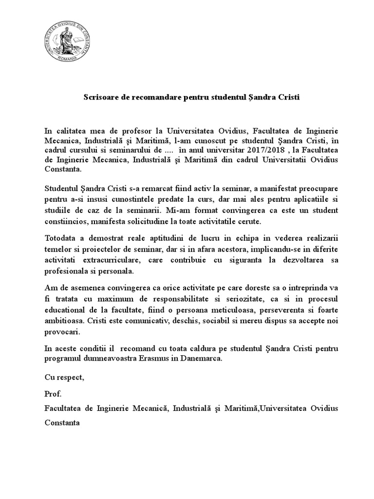 Name is a dedicated student and thus far hisher grades have. Programele postuniversitare pot fi extrem de competitive mai ales atunci când oferă finanțare substanțială studenților lor deci recomandarea dvs. SCRISOARE DE MOTIVAŢIE În atenția Biroului Erasmus din Academia Navală Mircea cel Bătrân Va adresez aceasta scrisoare de intentie ca raspuns la anunțul dumneavoastra pentru granturile Erasmus pentru anul universitar 2018-2019.