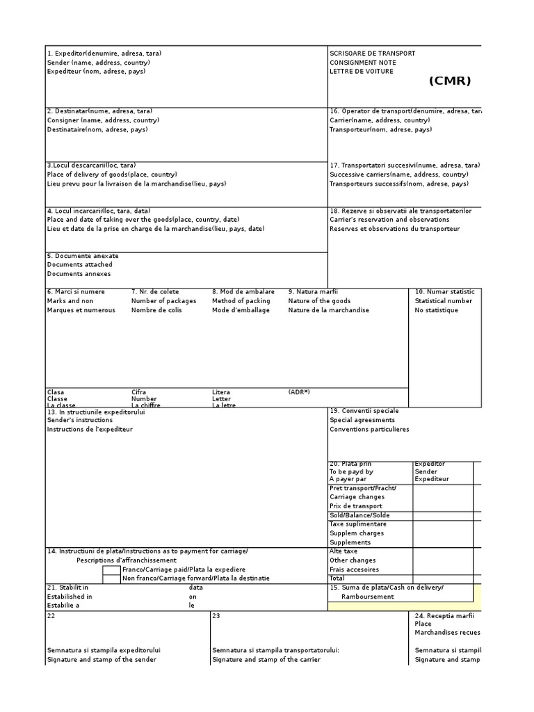 CMR este scrisoare internationala de transport contine 24 de casute instructiuni de completare continutul fiecarei casute ajutor de completare. Signature and stamp of the consignee. CMR-ul denumit si scrisoare de trasura reglementeaza transportul marfurilor de orice fel cu autocamioane.
