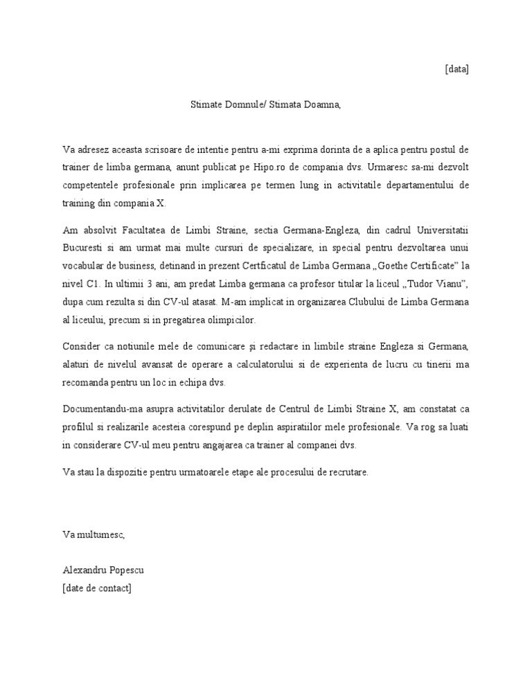 Model Scrisoare de Intentie Scris de Super User Sunteți aici. Primul model de scrisoare de intentie Stimate DomnuleDoamnă Vă adresez această scrisoare de intenţie ca raspuns la anunţul dumneavoastră pentru postul vacant pe care îl aveţi în companie. Cum se scrie corect o scrisoare de intentie in limba germana Cum se scrie un CV in limba germana pentru angajare Sfaturi utile pentru studentii care termina studiile in Franta si vor sa se angajeze.