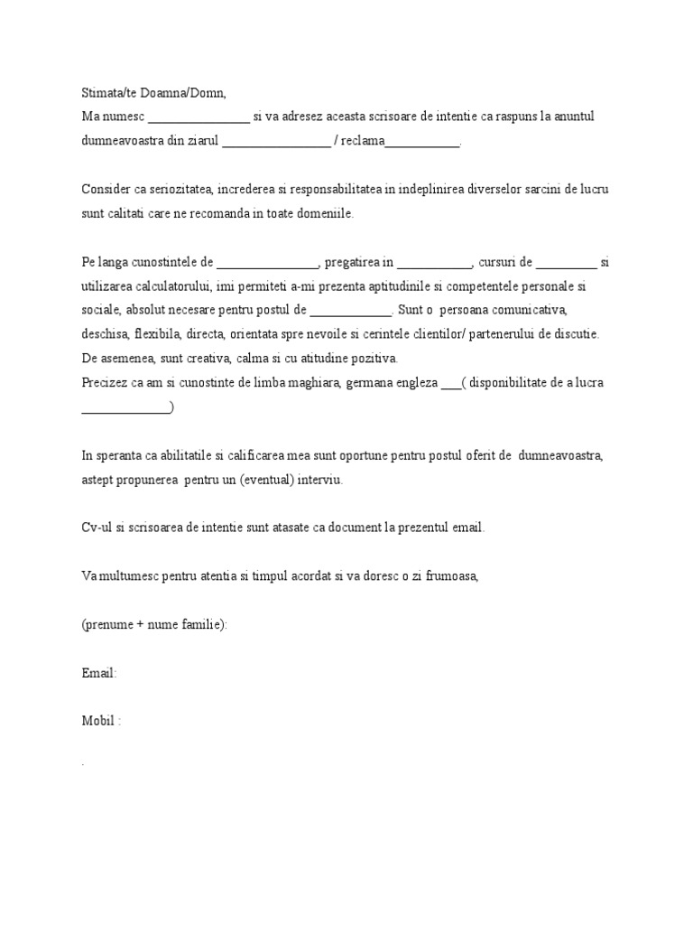 Modele de scrisoare de intentie. Doresc să aplic pentru postul depost de care am luat la cunoștință prin intermediulîn data de. Pregateste scrisori de intentie beton.
