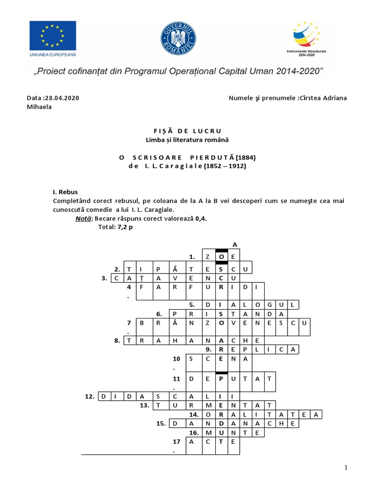 Fișă De Lucru O Scrisoare Pierduta Pdf