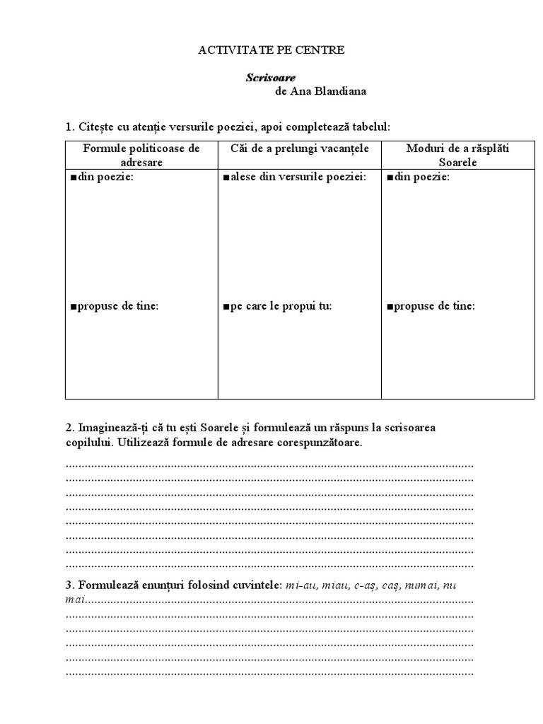 Învăţământ primar - Limba şi literatura român ă. Puteti gasi foarte multe referate accesand categoriile din partea dreapta despre Scrisoare catre soare de ana blandianaUita-te mai jos si o sa gasesti cele mai relevante rezultate pentru cautarea Scrisoare catre soare de ana blandiana. Fișă de lucru - Interactive worksheet.