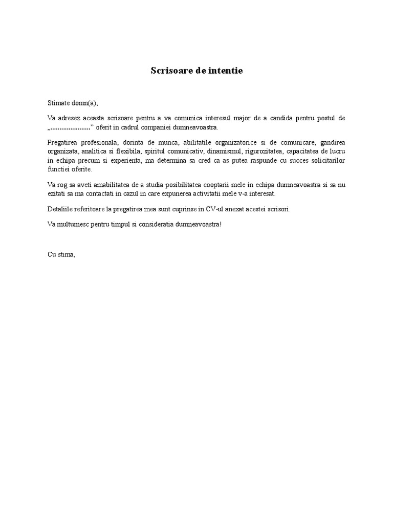 Va adresez prezenta scrisoare de intentie ca raspuns la anuntul dumneavoastra pentru postul vacant pe care il aveti in institutie.