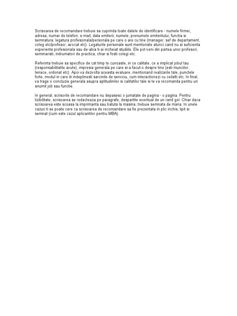 Scrisoarea de recomandare este unul dintre cele mai importante aspecte pentru o persoana aflata in cautarea unui loc de munca deoarece aceasta reflecta anumite calitati pe care le detine care pot deveni un atuu la interviul de angajare. Răspuns la cererea de ofertă. Pentru a face un scurt rezumat al tuturor celor de mai sus o scrisoare de recomandare ar trebui să aibă un anumit format și să includă informații utile pentru angajator.