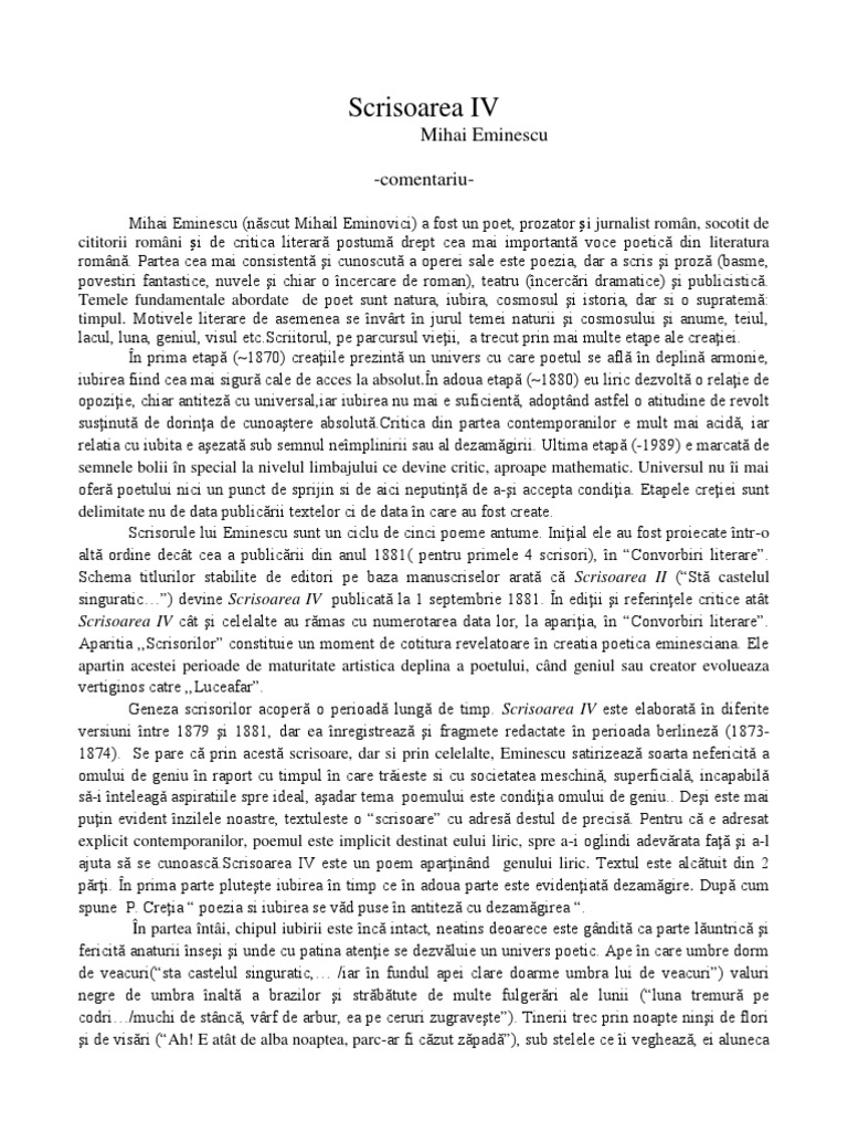 Comentariu Literar Scrisoarea Iv Docx Comentariu Literar Scrisoarea Iv Mihai Eminescu N U0103scut Mihail Eminovici A Fost Un Poet Prozator U0219i Jurnalist Course Hero
