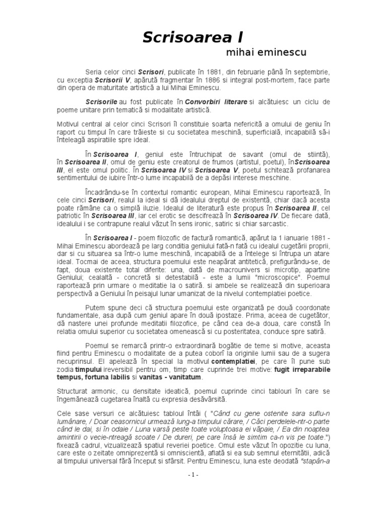 Poemul Scrisoarea I este alcatuit dintr-o cosmogonie incadrata de doua meditaii. SCRISOAREA I comentariu literar Seria celor cinci Scrisori publicate în 1881 din februarie pânǎ în septembrie cu exceptia Scrisorii V apǎrutǎ fragmentar în 1886 si integral post-mortem face parte din opera de maturitate artisticǎ a lui Mihai Eminescu. Receptiv la romantismele europene de secol XVIII si XIX si-a asimilat viziunile poetice occidentale.