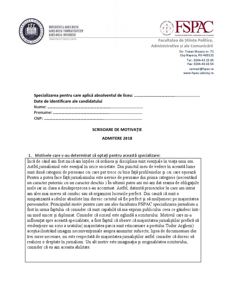 Baza de date - barem eseu motivational Jurnalism admitere. Cristi Popescu Aleea Unirii nr. Primul model de scrisoare de intentie Stimate DomnuleDoamnă Vă adresez această scrisoare de intenţie ca raspuns la anunţul dumneavoastră pentru postul vacant pe care îl aveţi în companie.