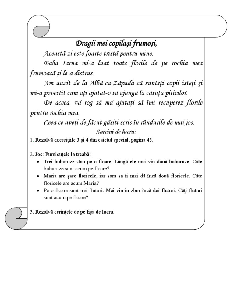 Li se prezintă o scrisoare de la Zâna Iarna în care aceasta se arată a fi supărată căci a uitat cum ar trebui să se comporte eaa uitat care-i sunt trăsăturile și ce ar trebui să facă încât să fie iarnă cu adevărat. Fiindca gerul de afara nu ne-a permis sa mergem in padure ne-am hotarat sa aducem noi padurea la gradi. Dorinta vi s-a-mplinit Iarna sunt si am venit Cu stelute-n frunte Zapada am presarat Sus in varf de munte Florile le-am invelit In alba plapumioara Gerul rece a sosit Ce placut e afara.